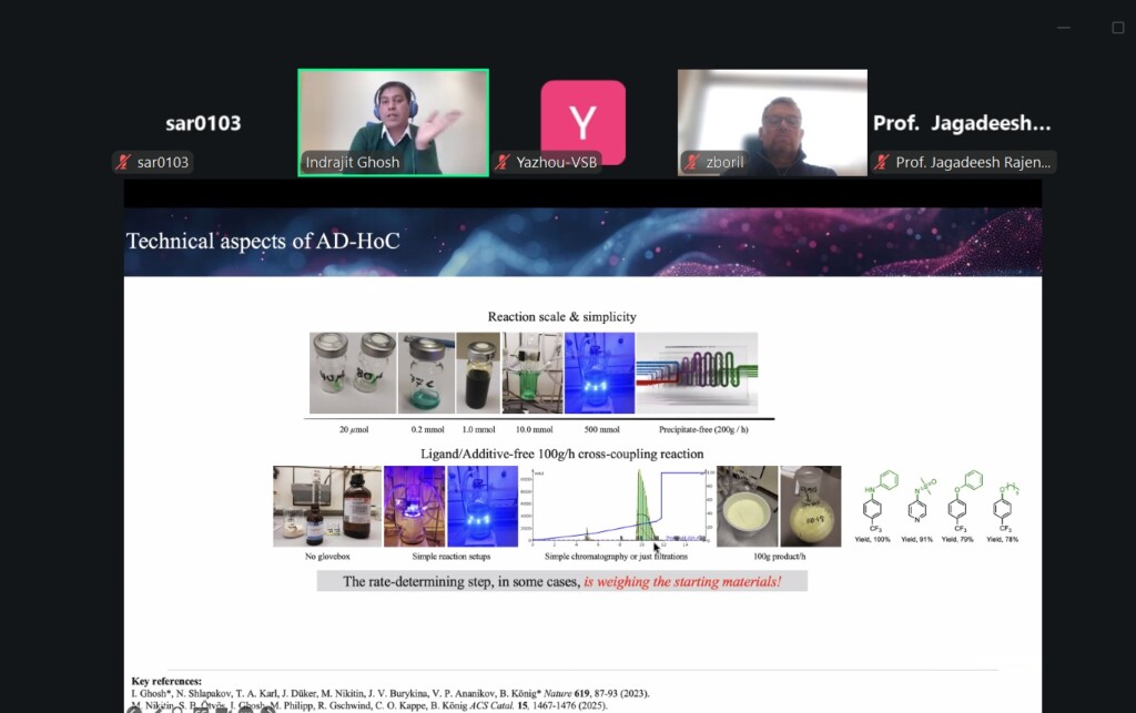 Jedním z přednášejících byl i Indrajit Ghosh z MEL, který vystoupil s přednáškou Photoredox Catalysis with One or Two Photons and Electron Transfer.